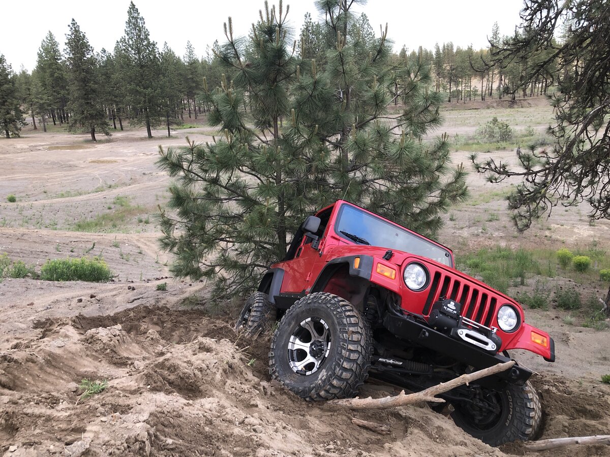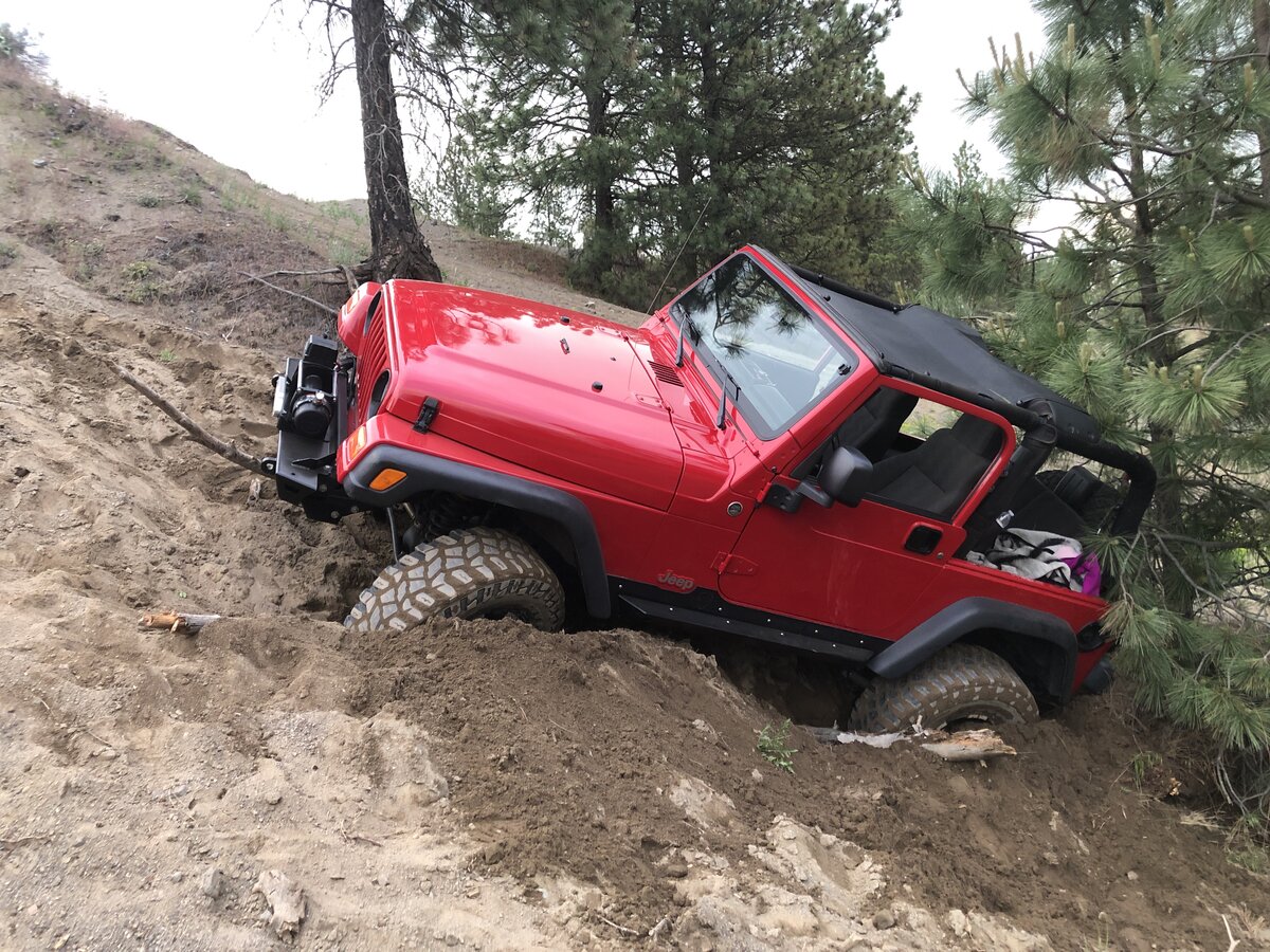 The rig performed flawlessly. Theraised belly allowed me to crestlots of places I would high center before. Amazing.A couple weeks ago we had a record rainfall in Spokane. It rutted out a lot of the hill climbs. This is good, but the dirt and sand were too loose and I started to fall into this tree. Before I knew it I was in the tree. I don’t have a winch rope now bc it was compromised and I’m waiting on my TRE. So I dug it out3 times, and finally, after calling forum member