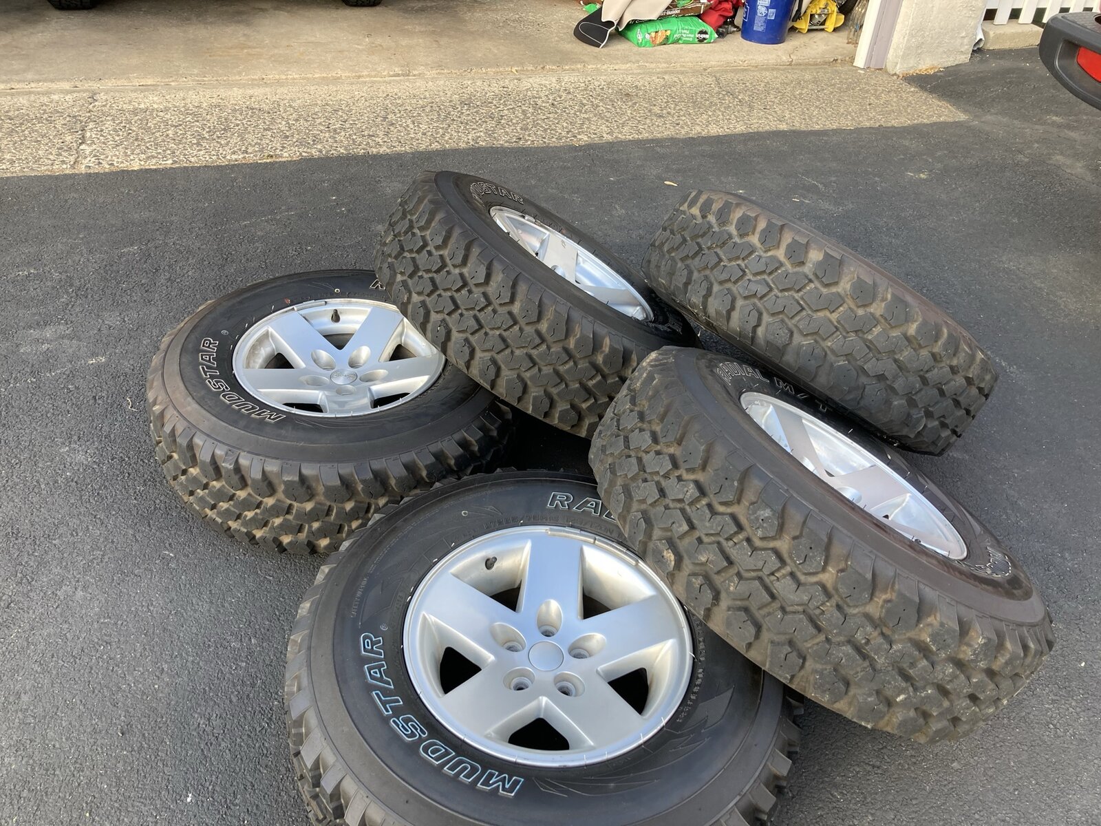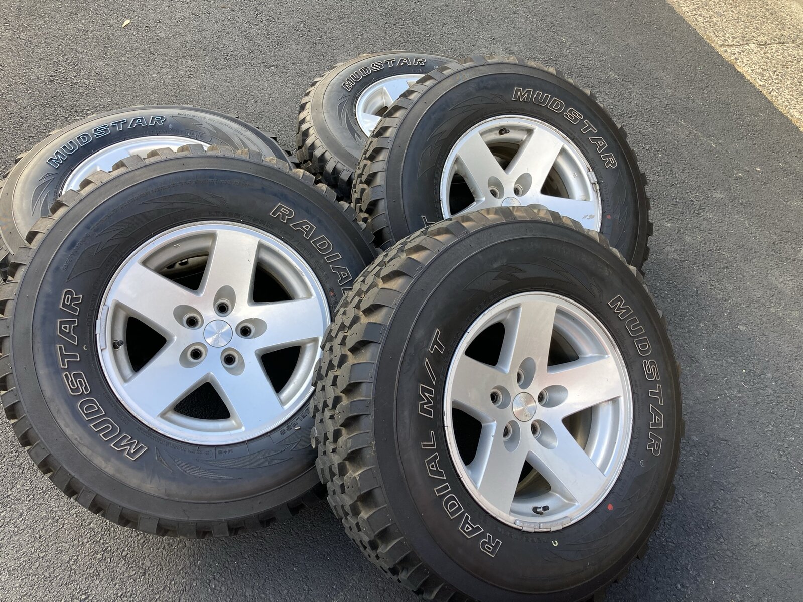 Have a set of 5 16x8 Moab wheels with 32” Mudstar MTs mounted. Tires have about 1500 miles on them. Spare has no wear. Tires are 265/75-16. The spare is the newer Moab wheel. The other 4 are the older Moab wheel. theres some curb rash on one wheel and some minor scrapes here and there. Overall decent set of wheels