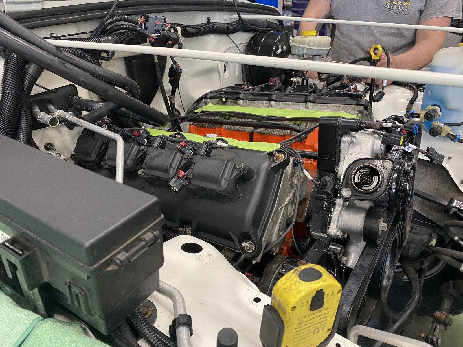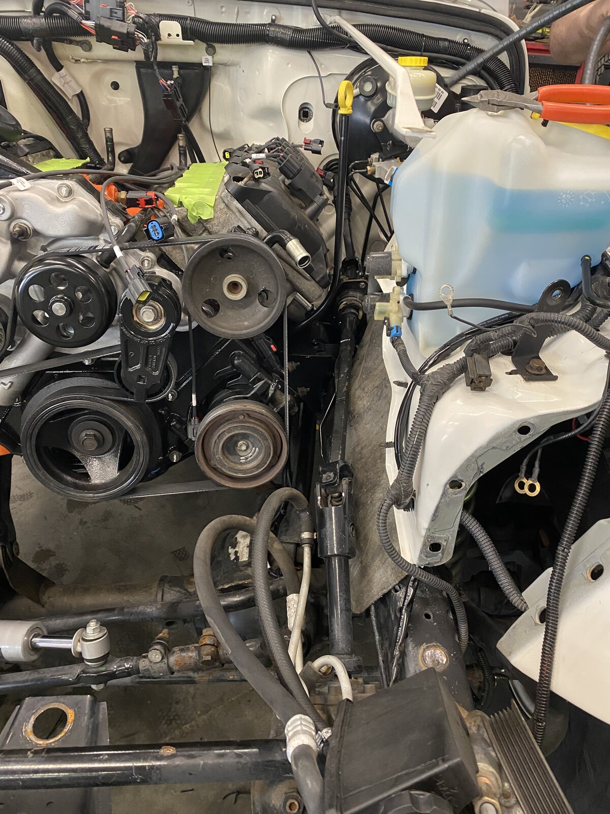Still not a lot of visual progress but tons more progress with wiring getting done today. The extra things the installer is doing to make everything look as factory and hidden as possible has blown me away. Small moves in the way some of the factory harnesses were routed are making huge differences in the way it looks. He’s pointing out things to me he's changed and it looks so much better. Got the bracket on for the steering column so that’s all done. No clearance issues with that. New body mount bushings all around went in easily. I believe he said they’ll start AC lines tomorrow and getting the radiator and fans in place. The intake was supposed to be back from powder coat today but it’ll be tomorrow. Still a little more work to do and it sounds like he’s shooting to be done Wednesday. The tune from the 6.1 swap they just finished will get loaded up and we’ll see what’s what. They also did a small cam in the previous swap so hopefully everything should be pretty well in line. The big difference between the swaps though is the other was an automatic and mine is using the AX15. Nothing really electronic about that transmission so it may not be a big deal but we’ll see. Hopefully just a few adjustments on the computer and it’ll be fine. But either way we will get it all cleaned up on the dyno and see what kind of numbers it makes next week hopefully.
