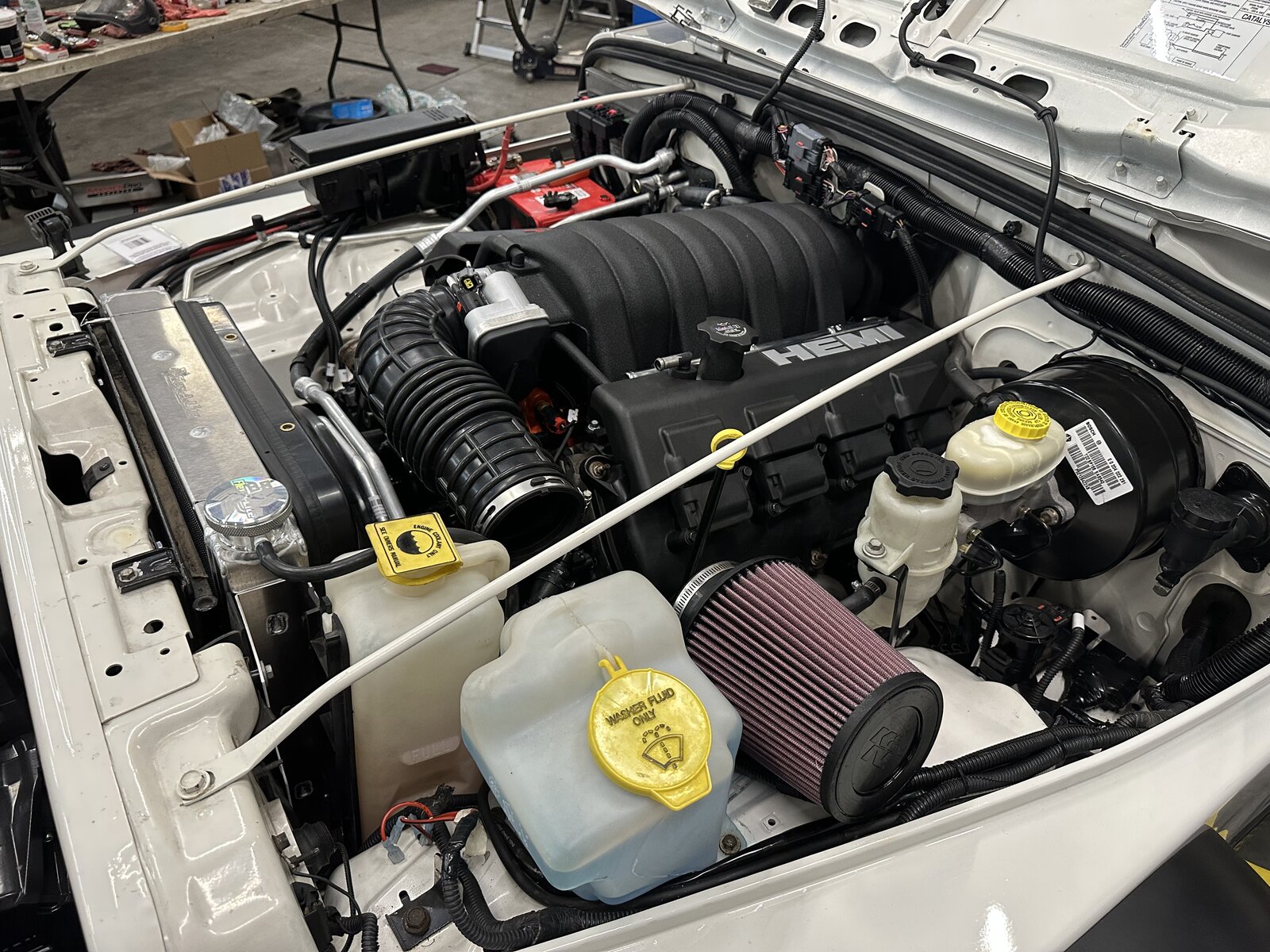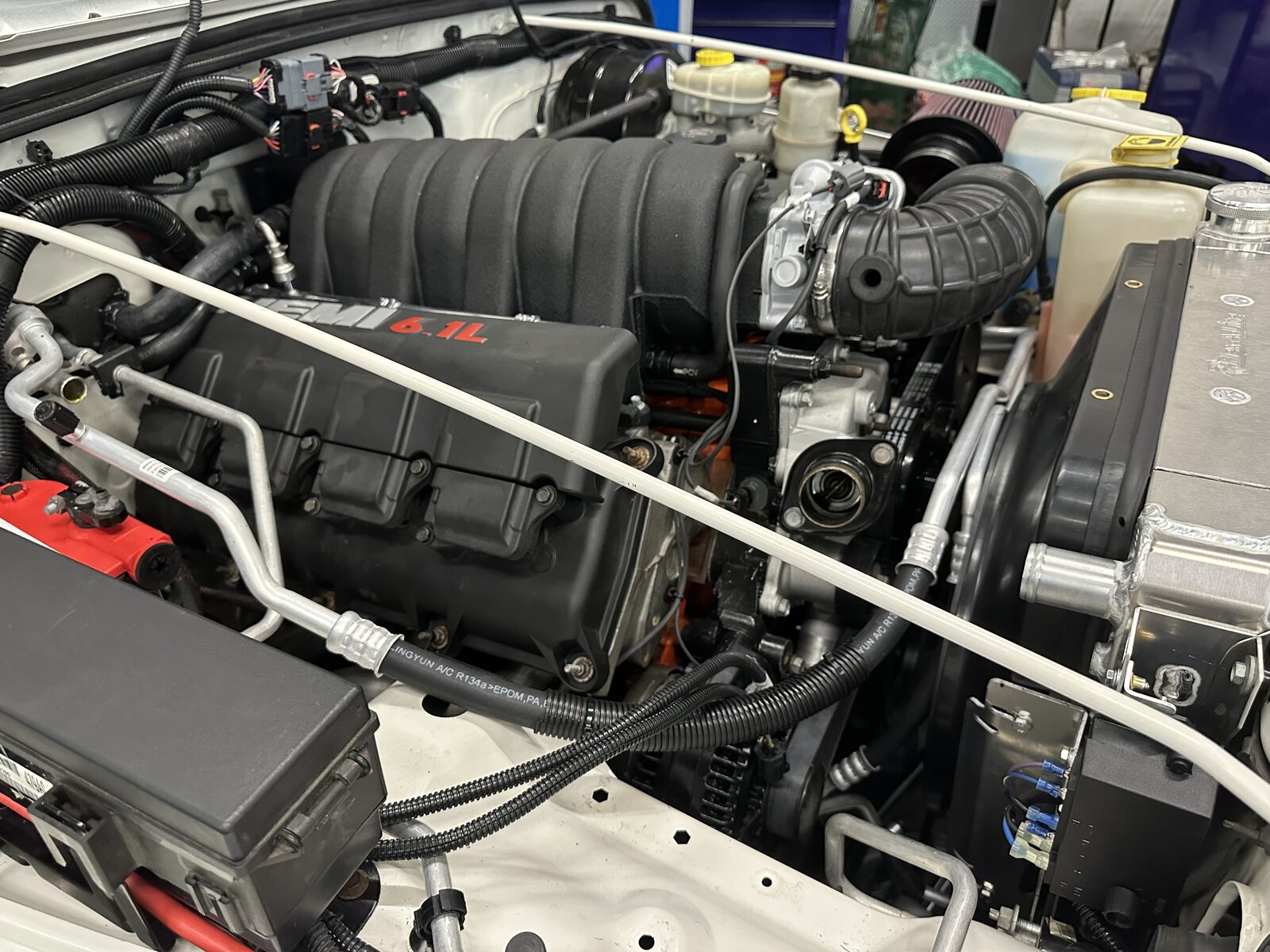 Didn’t bring my phone in with me today but wasn’t a bunch to see. AC lines got done. Radiator and fan got mounted up on the grill. Realized the elbow on the power steering pump wasn’t facing the right way and wasn’t going to work with the reservoir location. Through a series of trying some different reservoirs and to keep from cutting and re-welding the elbow the right way, a Dodge Avenger reservoir mounted remotely works perfect and actually hides out of the way perfect and looks super clean. I’ll grab some pictures tomorrow. Should be about 95% done tomorrow and could very well be the day we test fire. Definitely taking it to the tuner though middle of next week. We were back and forth on taking it but I really want to see what kind of numbers it makes and want to be sure the tune is cleaned up and it’s running how it should.