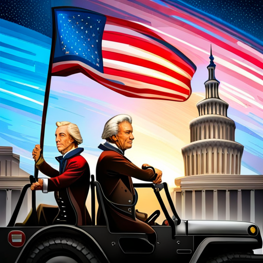 "george washington and Andrew Jackson driving a jeep wrangler TJ with an american flag on it, on the 4th of July".