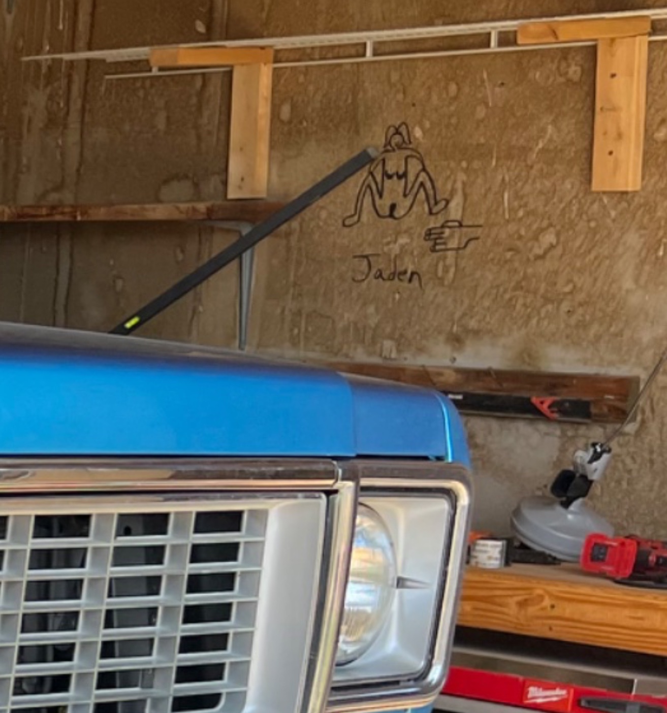Funny you noticed that! That was there when we moved in. Eventually when I redo this shop I’ll take care of it. First I need to pour a concrete floor.