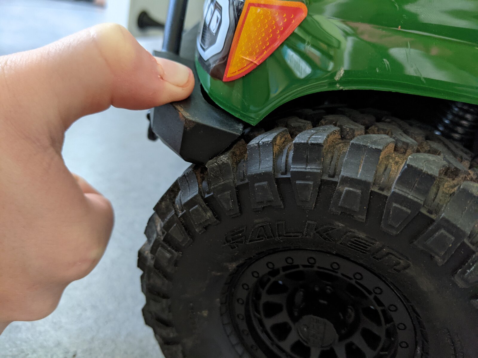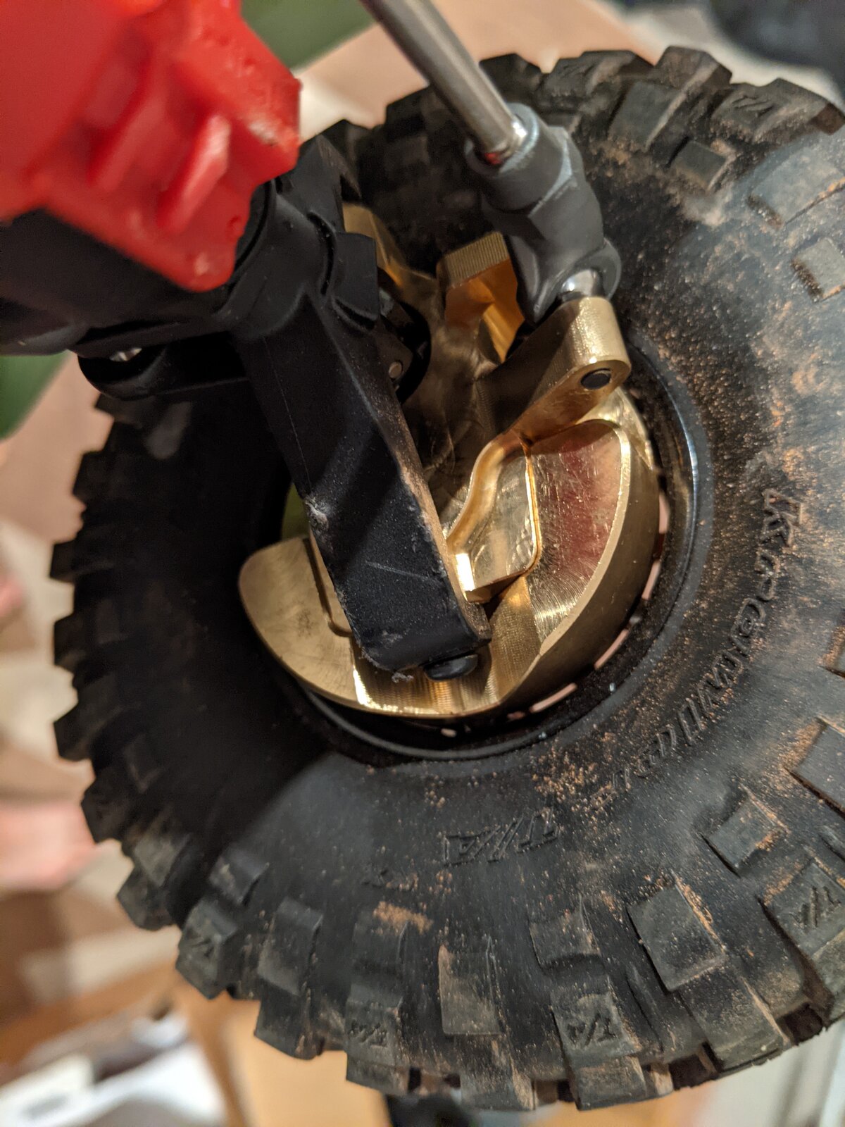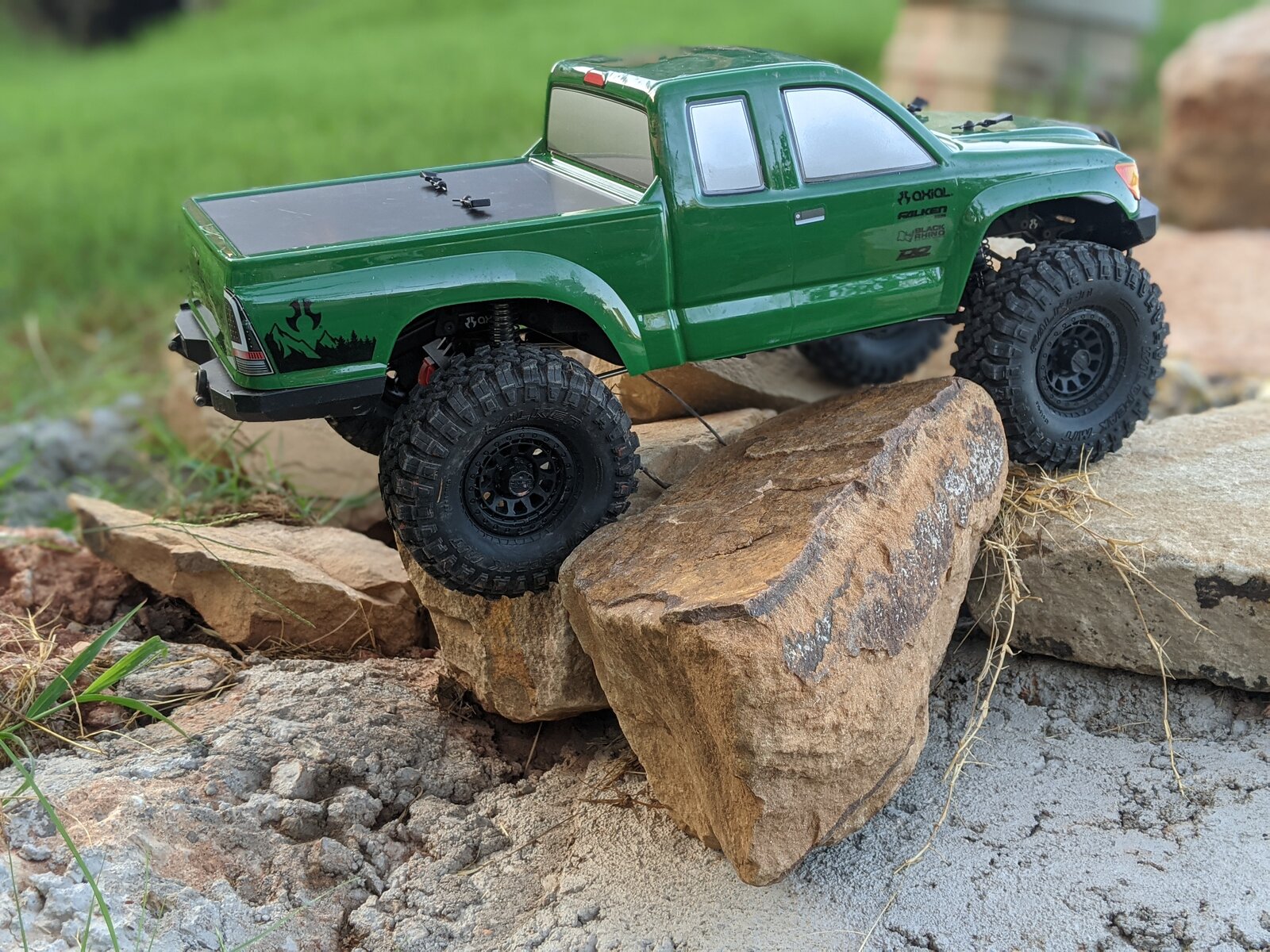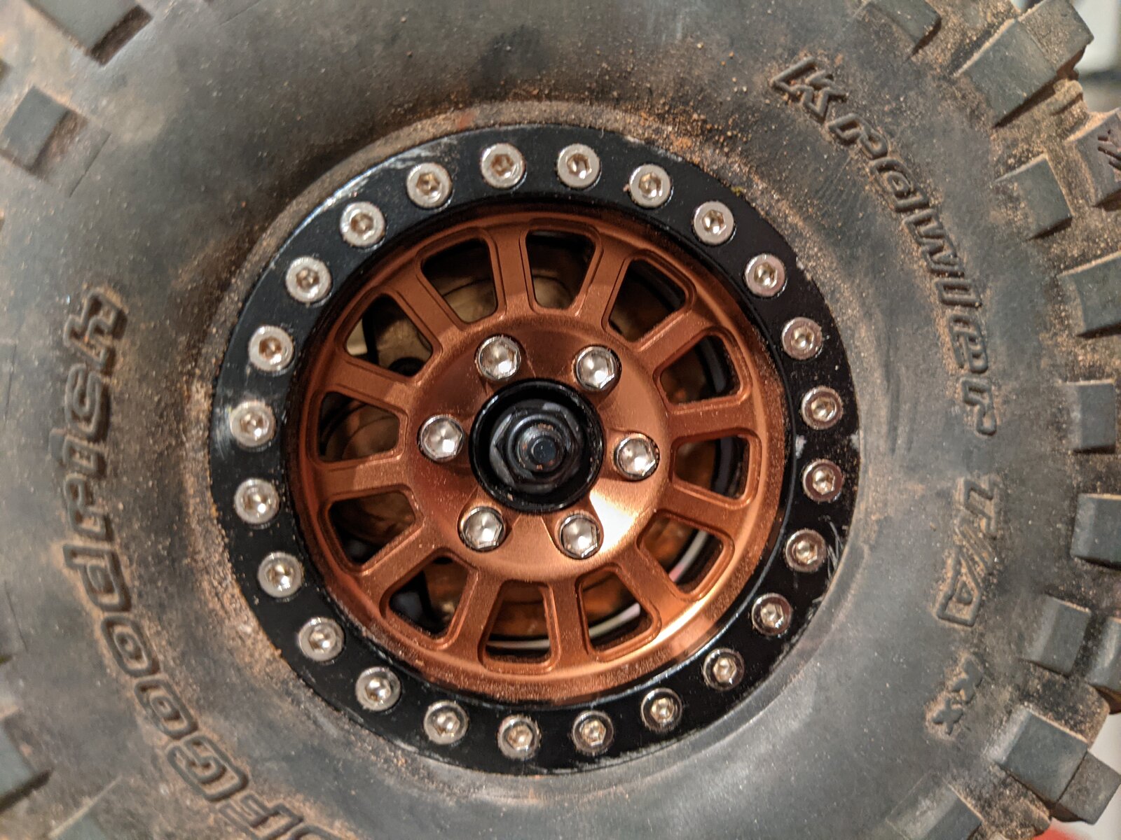 Amazon Chinese beadlocks that look like and probably are identical to an Injora model, with Axial BFG Krawler KX 4.7" tires and the foams they came with. They're very noticeably softer and wrap the rocks much better than the falkens it came with.
