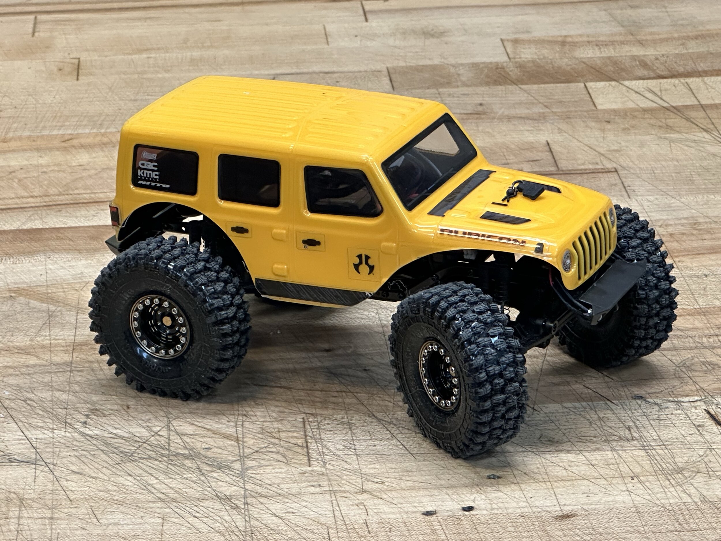 , Castle BEC, 2S, and Axial XR10 beadlocks. Caught 2 Novak ESCs on fire, got annoyed, and shelved it. Reduced it to roller status gutting it to build the green 1.9 Barbie Jeep.