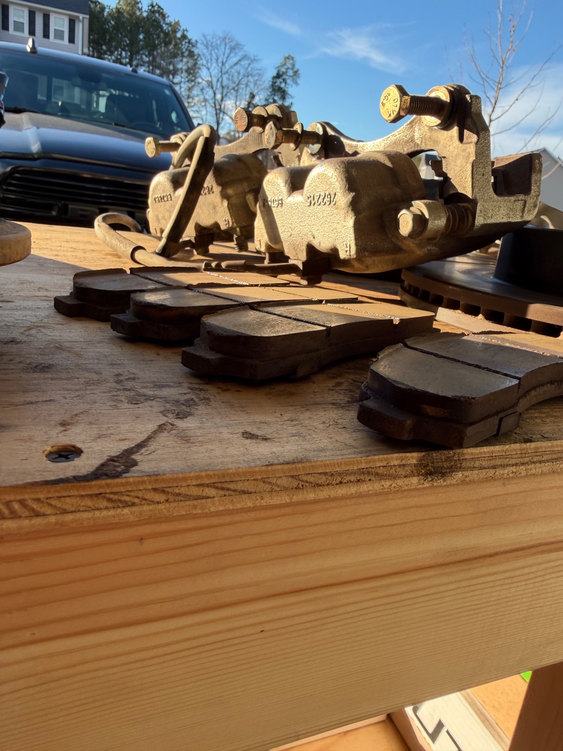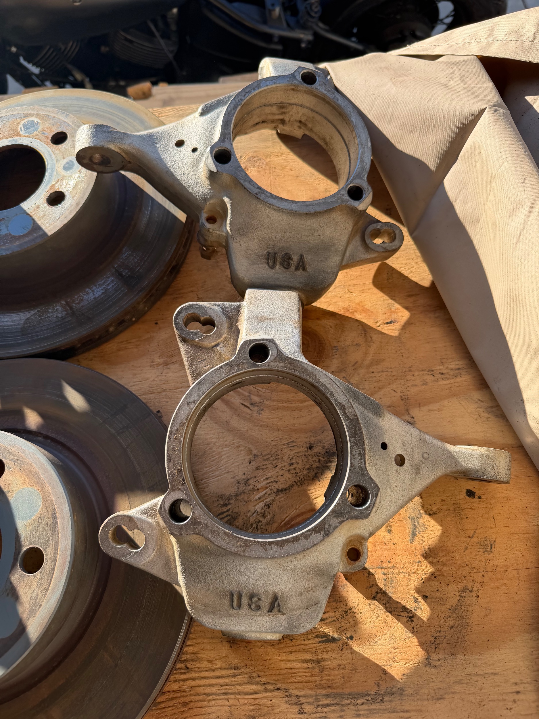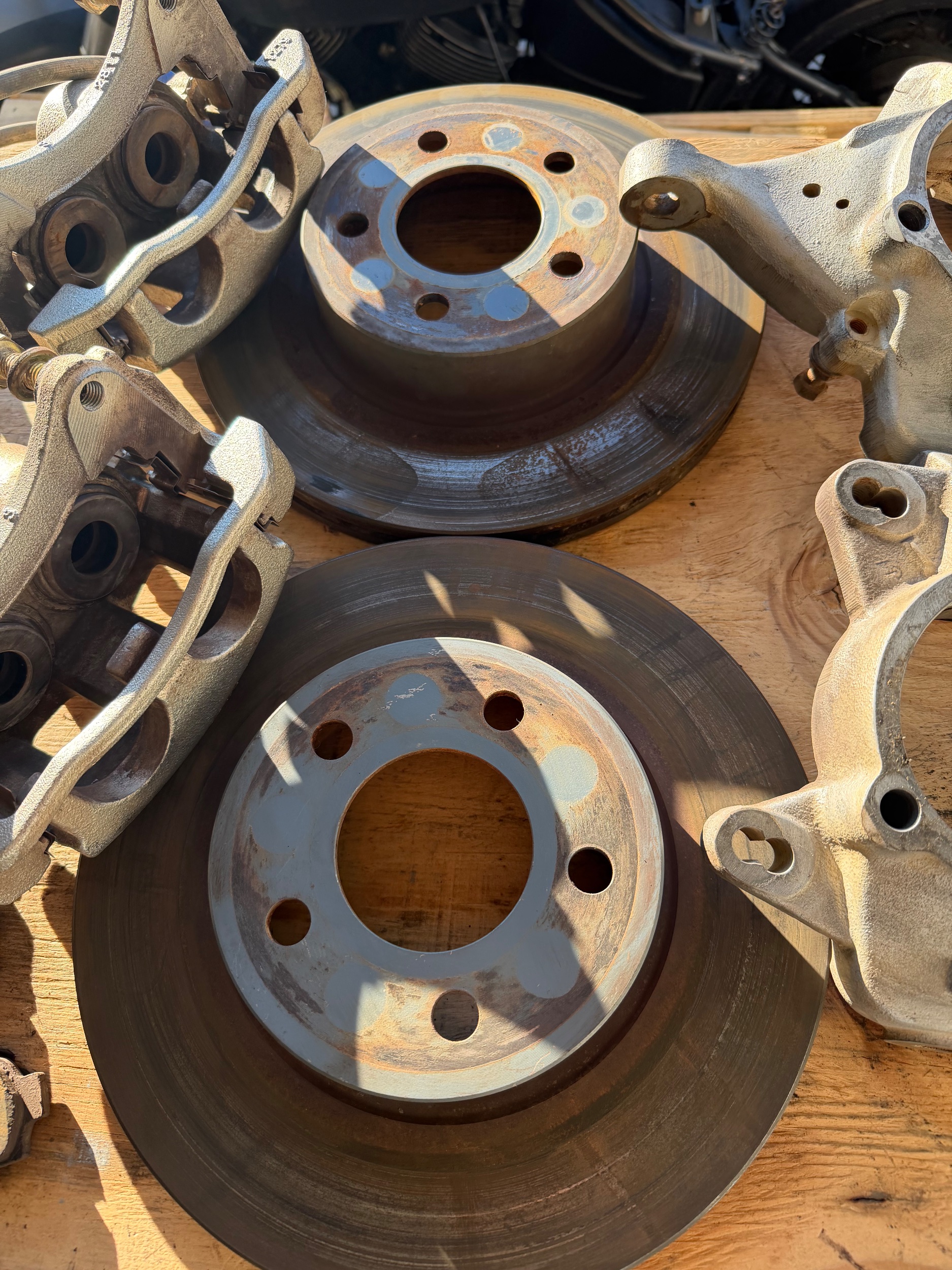 It is missing one of the backing plates for a brake pad but I’m sure Mr. Blaine could probably ship you some, and or just an all around new set of pads. The current pads have a lot of life left on them though. The hubs I think have about the same mileage and are trimmed to fit the rotors, however, the lugs are trimmed down for a 1” spacer.