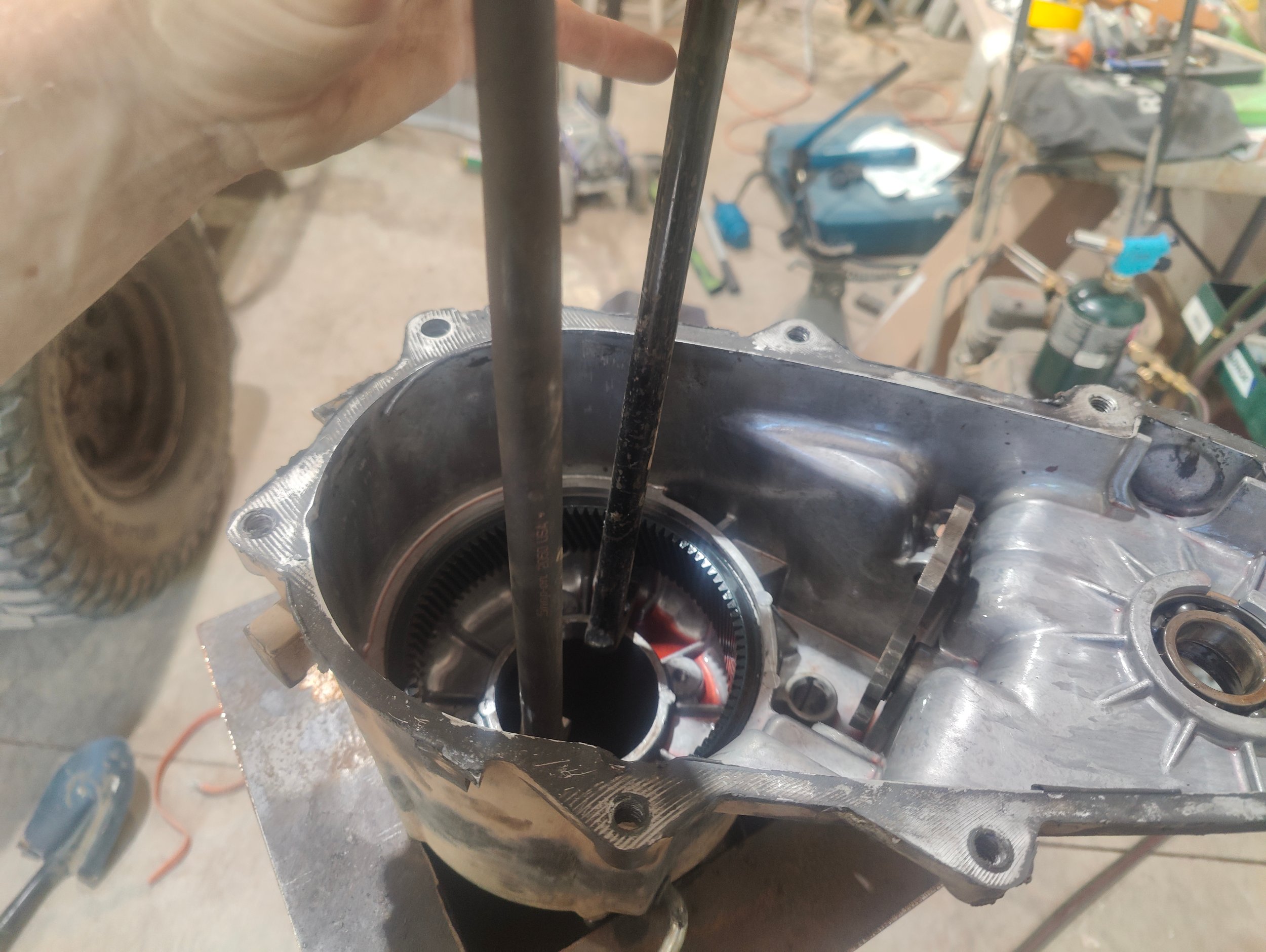 485 and it slid in a bit...but it wants to walk down catywampus and not straight. Tried various smaller hammers, tried my press which was a huge mistake because the angle iron I was using caught two teeth and chipped them. Hopefully I can file that out. Hour of pounding got me a messed up transmission side fence and the gear flush...but it needs to be .290 down from the face as measured. It's 97 in the shop. Wrapped the case in fiberglass for a slow cool because it seems like the right thing to do. Going to rehydrate and wait until it's cooler tonight and see if I can rig up my press better...I unbent 3/16 angle iron on try one. I probably should use the other gear to push.