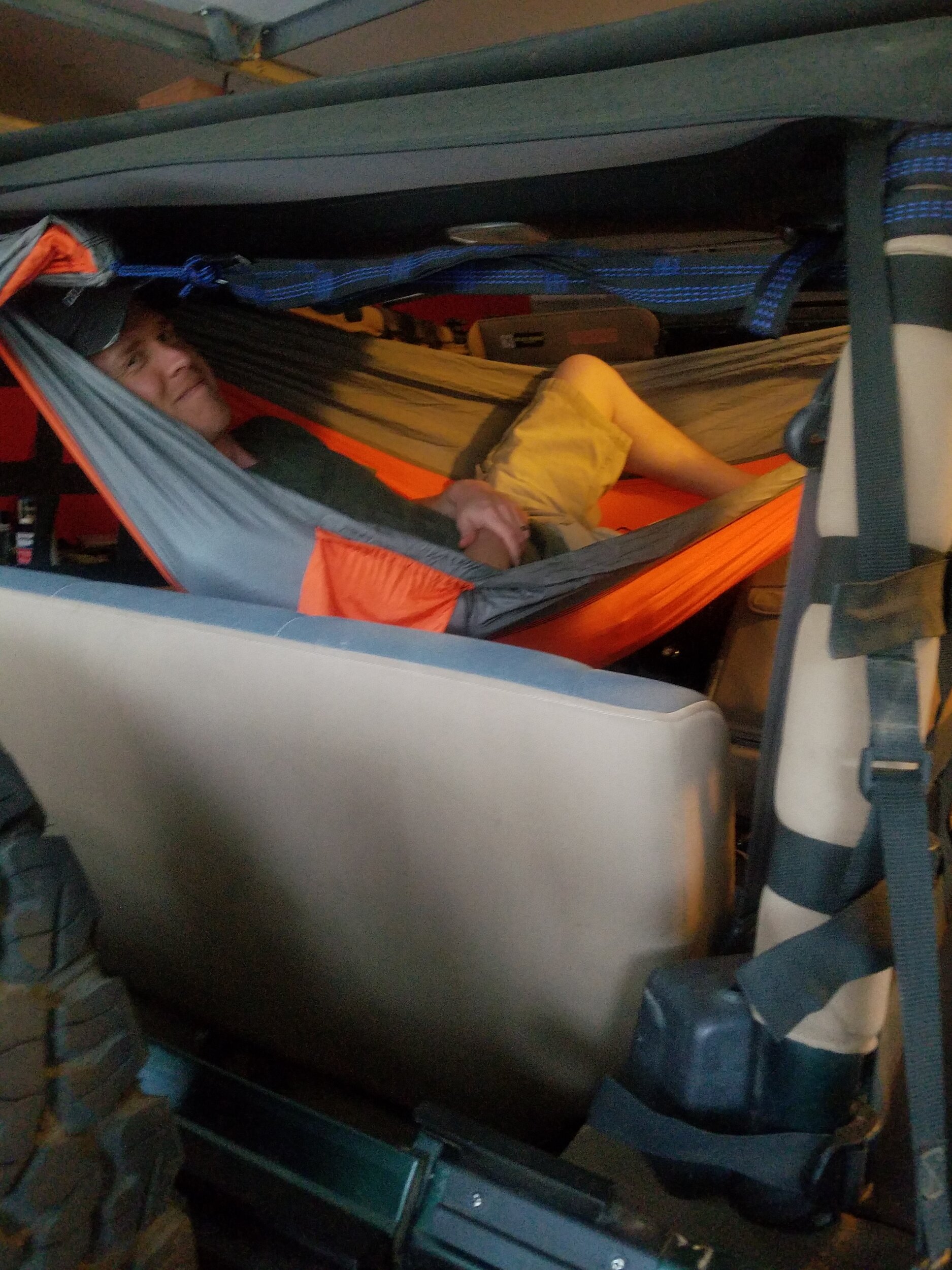 I've heard of the nalgene thing, never tried it in the hammock because the way it hangs in the TJ (like a banana) it's gonna slide down to my hips. But I don't camp that cold. It's high elevation Colorado but it's still August. Might get down to the 30s at the coldest, and I suspect the closed up soft top holds some of the heat in better than if I was just out in the open. At the very least I'm protected from wind. I'd have been in bad shape on these trips if I hadn't been inside the jeep.