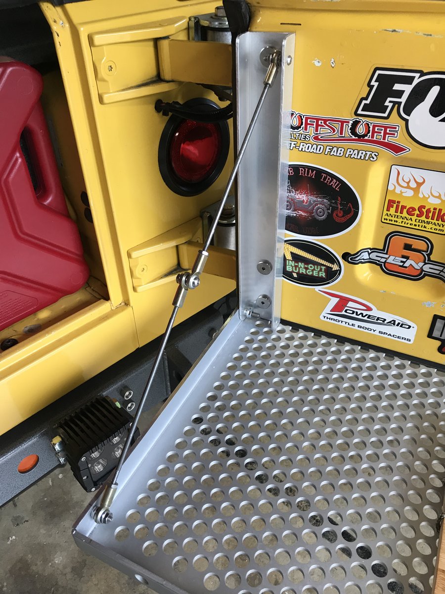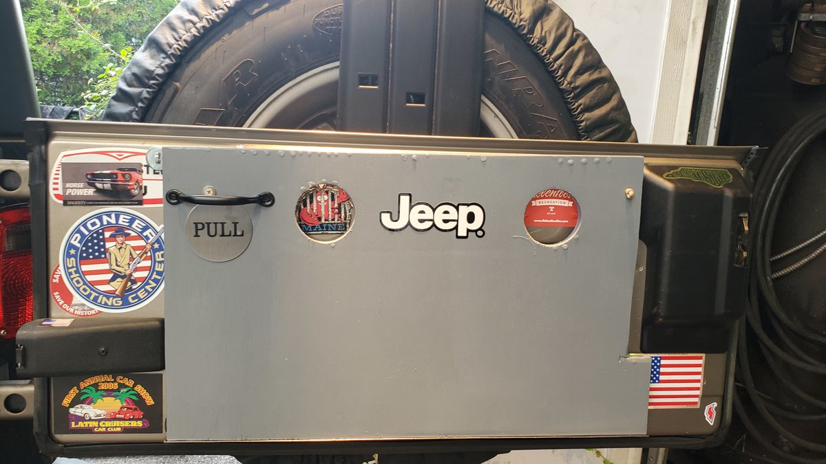 I recently made a second one that I've mounted to my LJ. I used 2 heavy duty SS cabinet hinges and screwed them to the tailgate. The table is a piece of pine sandwiched between a sheet of 1/16" aluminum and a heavy duty floor tile with a diamond plate pattern. It's held closed by a toggle clamp. I screwed 2 clear rubber bumpers to the tailgate for the table to rest against when closed. The chain I used to support the table rattled when I drove the LJ so I covered it with a piece of fabric wiring loom. The chain has a turnbuckle at the top so I can level the table (one way any way - can't do much about the other way other than to park as level as possible). Most importantly I added a bottle opener to the bottom right of the table. 🍺
