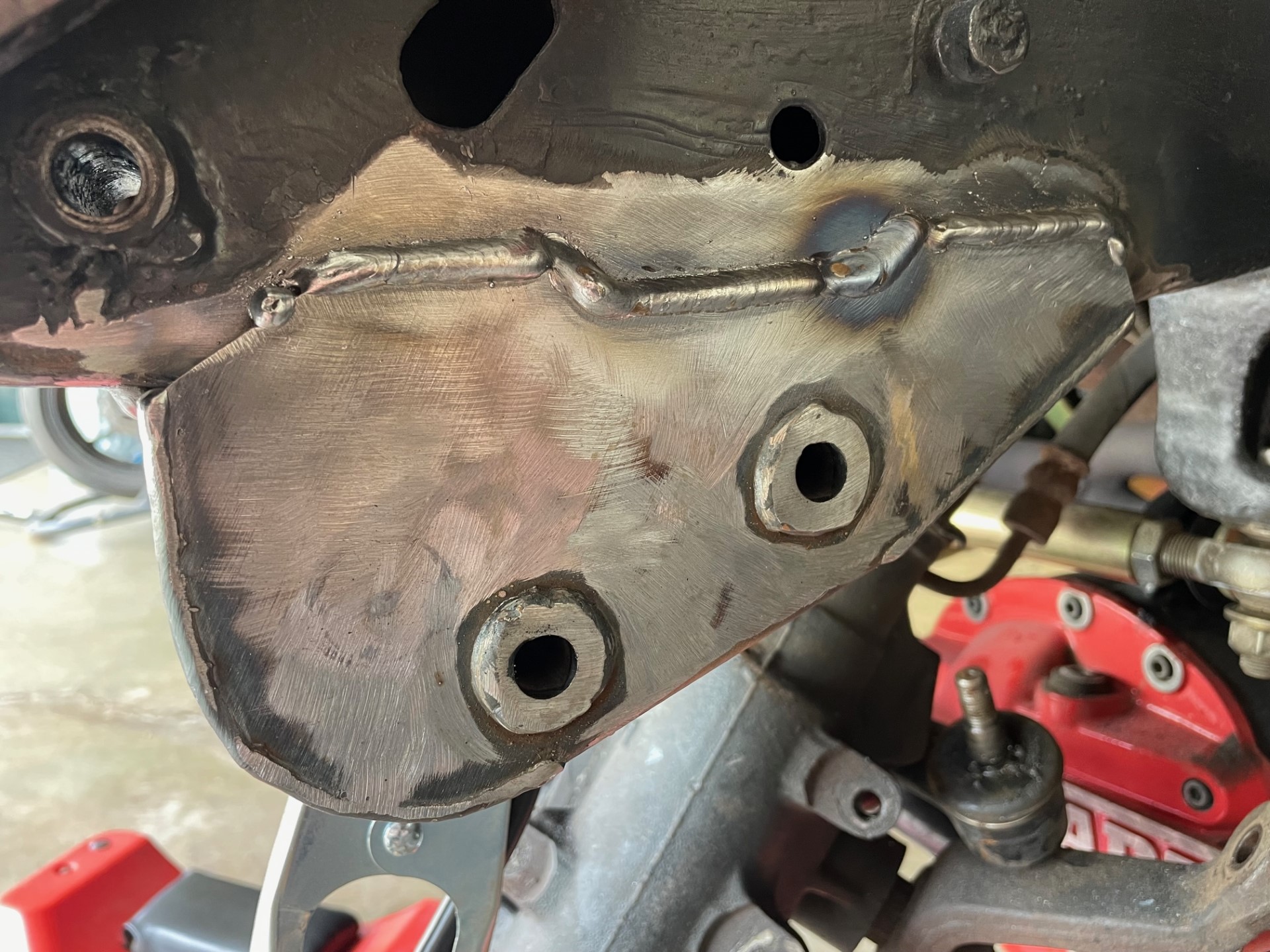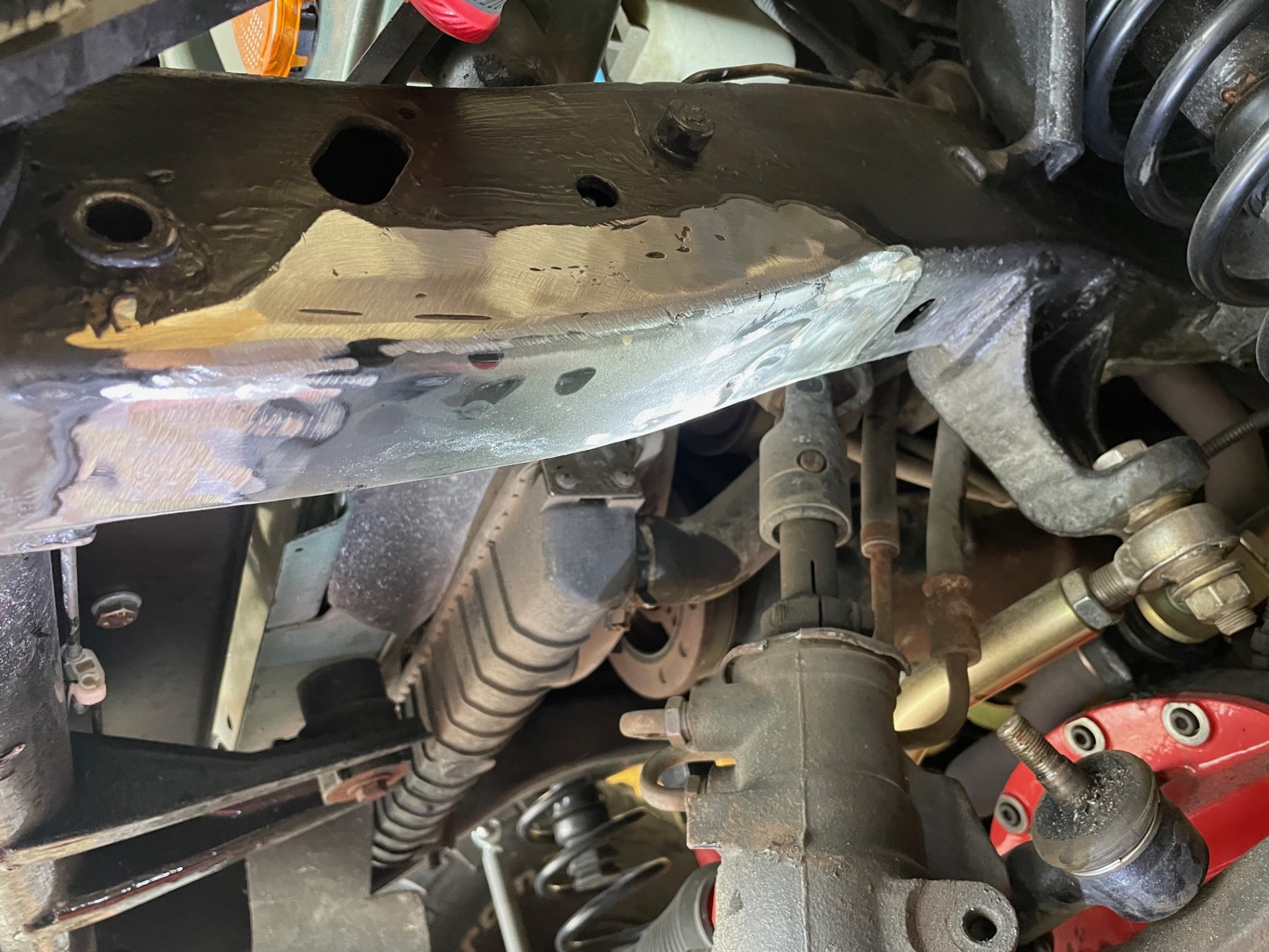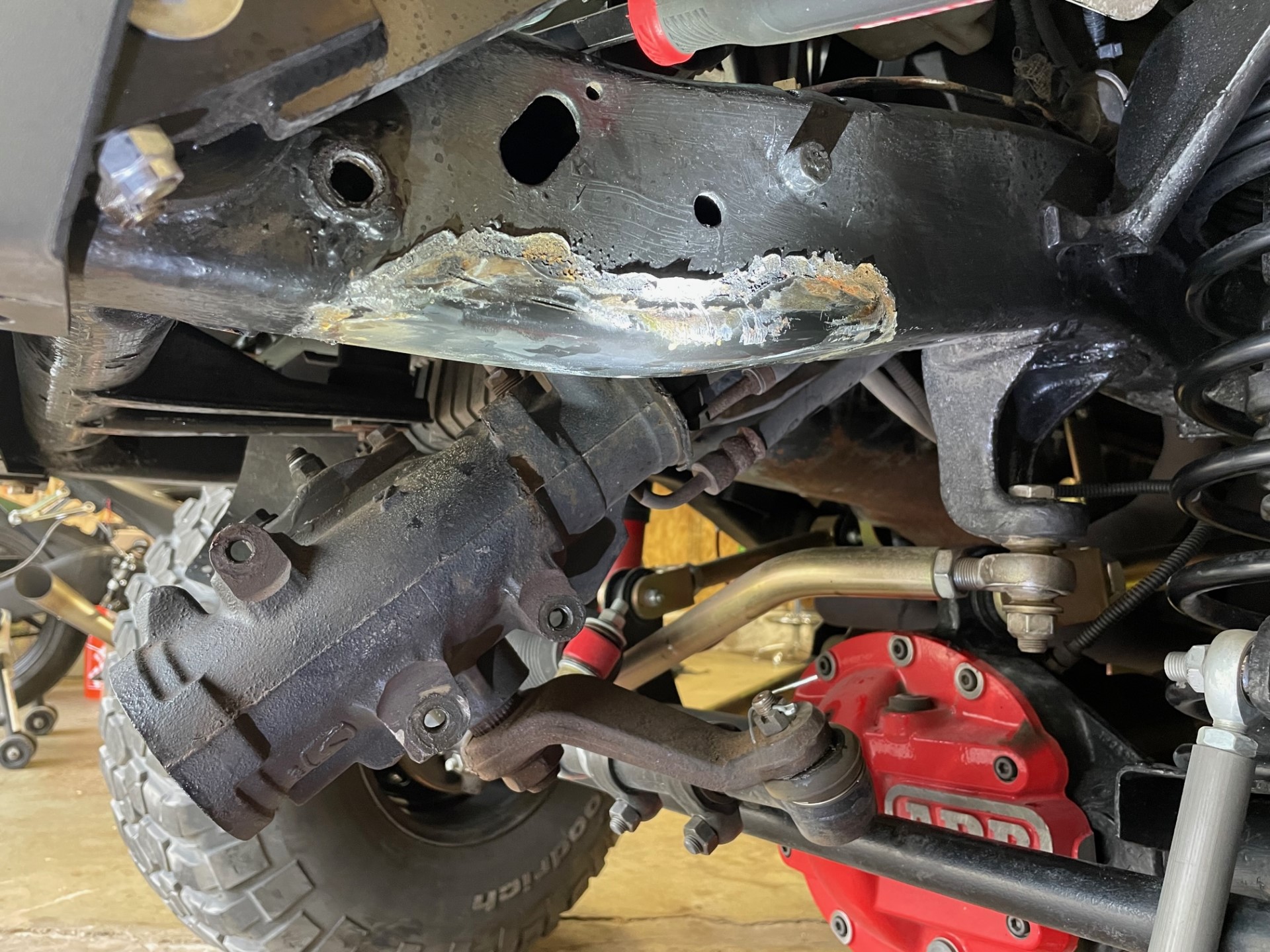The short story, is that during my front end repairs/upgrades earlier that year, I had replaced my frame bracket/mount that holds the steering box in place. Despite my lack of experience in welding, I had decided to weld the new bracket on myself. If you don't try, you're never going to learn. Well, that weld failed spectacularly. When I got home (and after I repaired it), I realized what had happened. In my nervousness to execute the weld properly, I forgot to turn the gas on. Yup. I made that bad of a mistake. #facepalm How I excepted that ugly of a weld as good enough????? No idea. I was probably just in a hurry and excited to be done with that portion of the project. No excuses here.