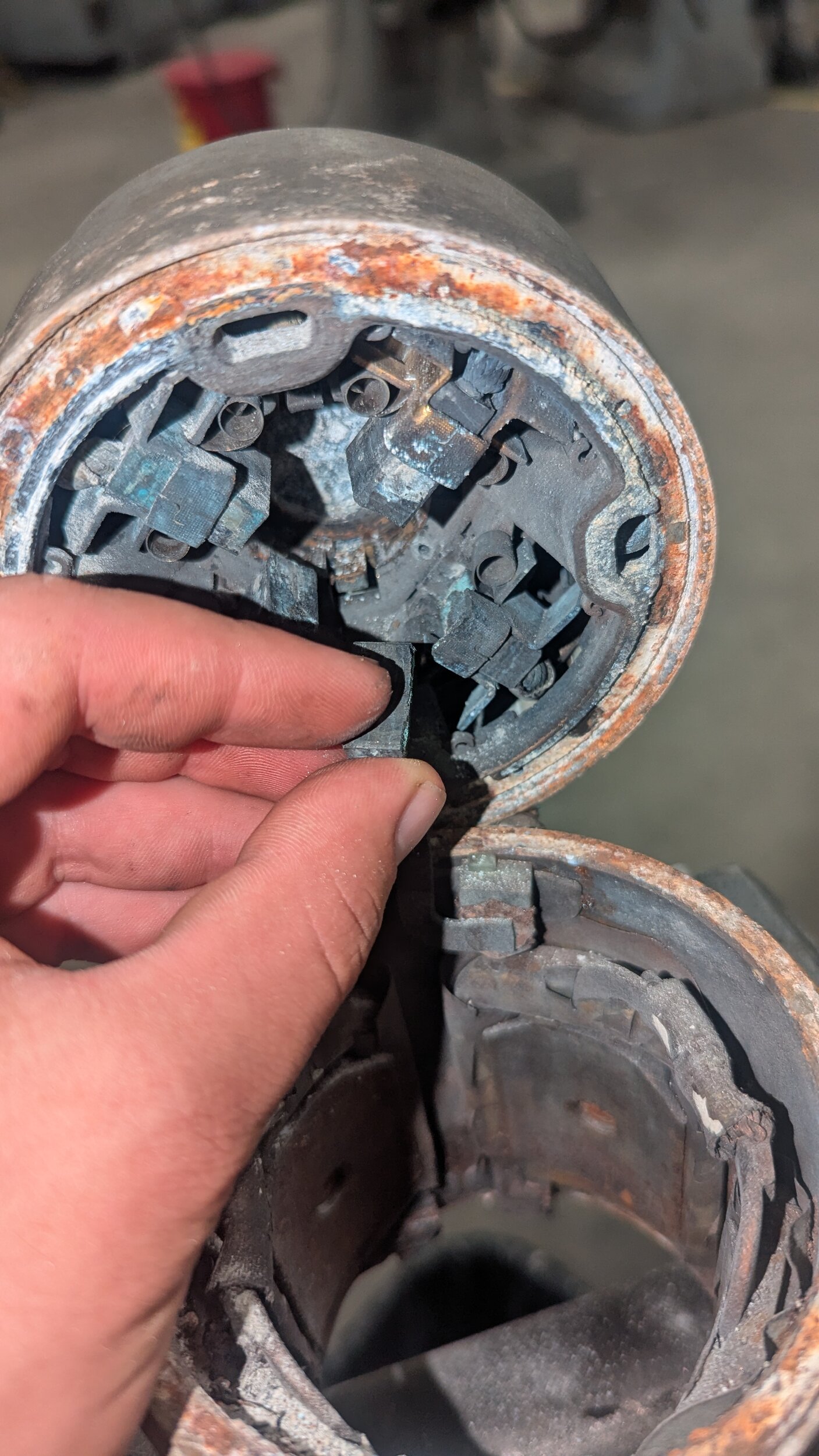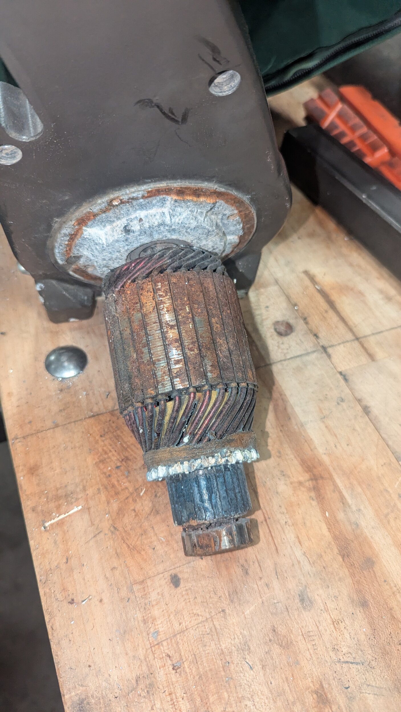 The original Armature is covered in corrosion, comutator is basically smooth, the brushes were all free to slide, but one of them broke in half. The rear bearing was rusted in place.