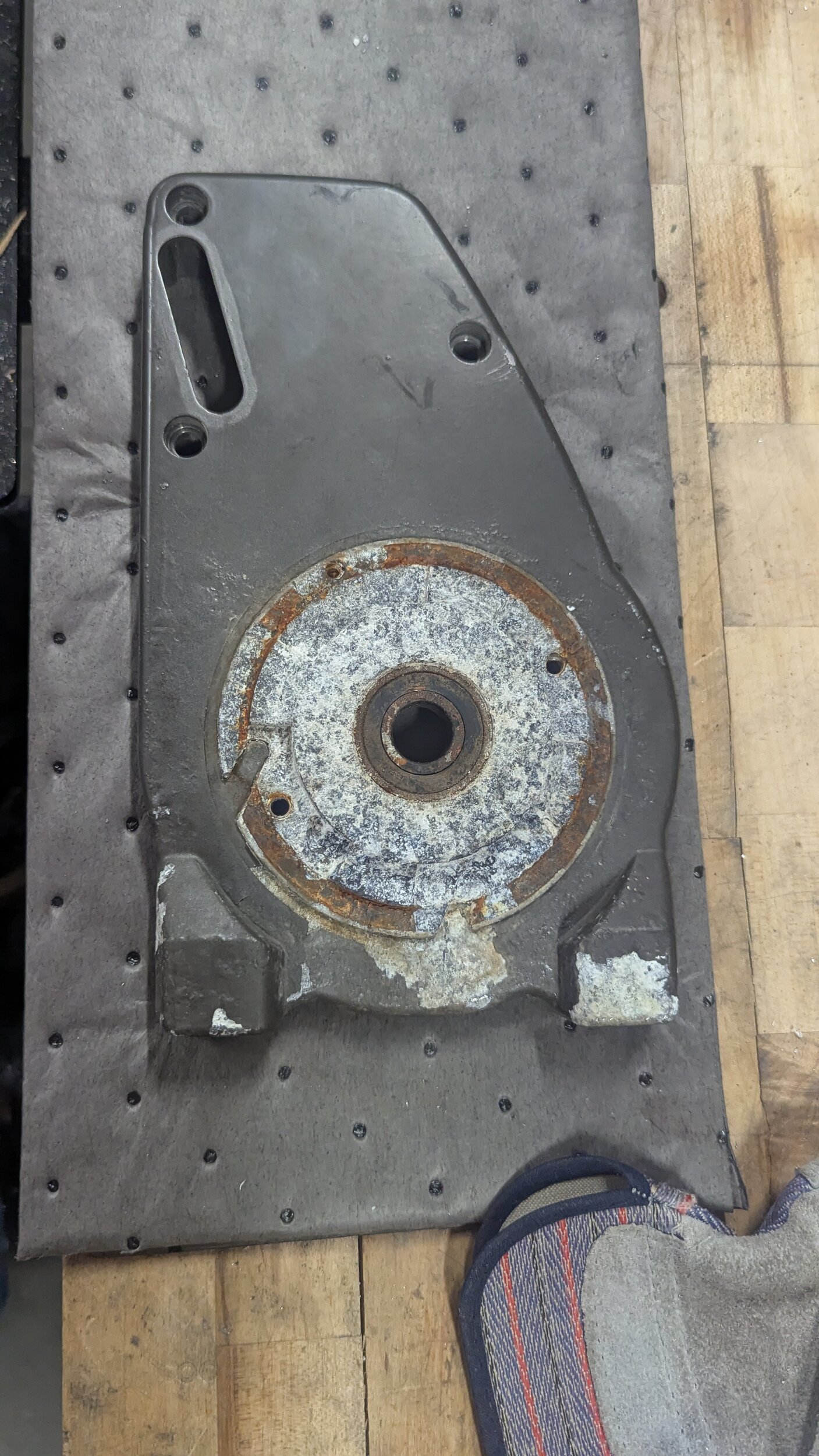 The good news is, the bearing in the mounting plate feels great, and I was able to attack it with a pick and some sandpaper and clean up the mounting surfaces and weeping holes,. I also removed the square nuts and will be replacing those.