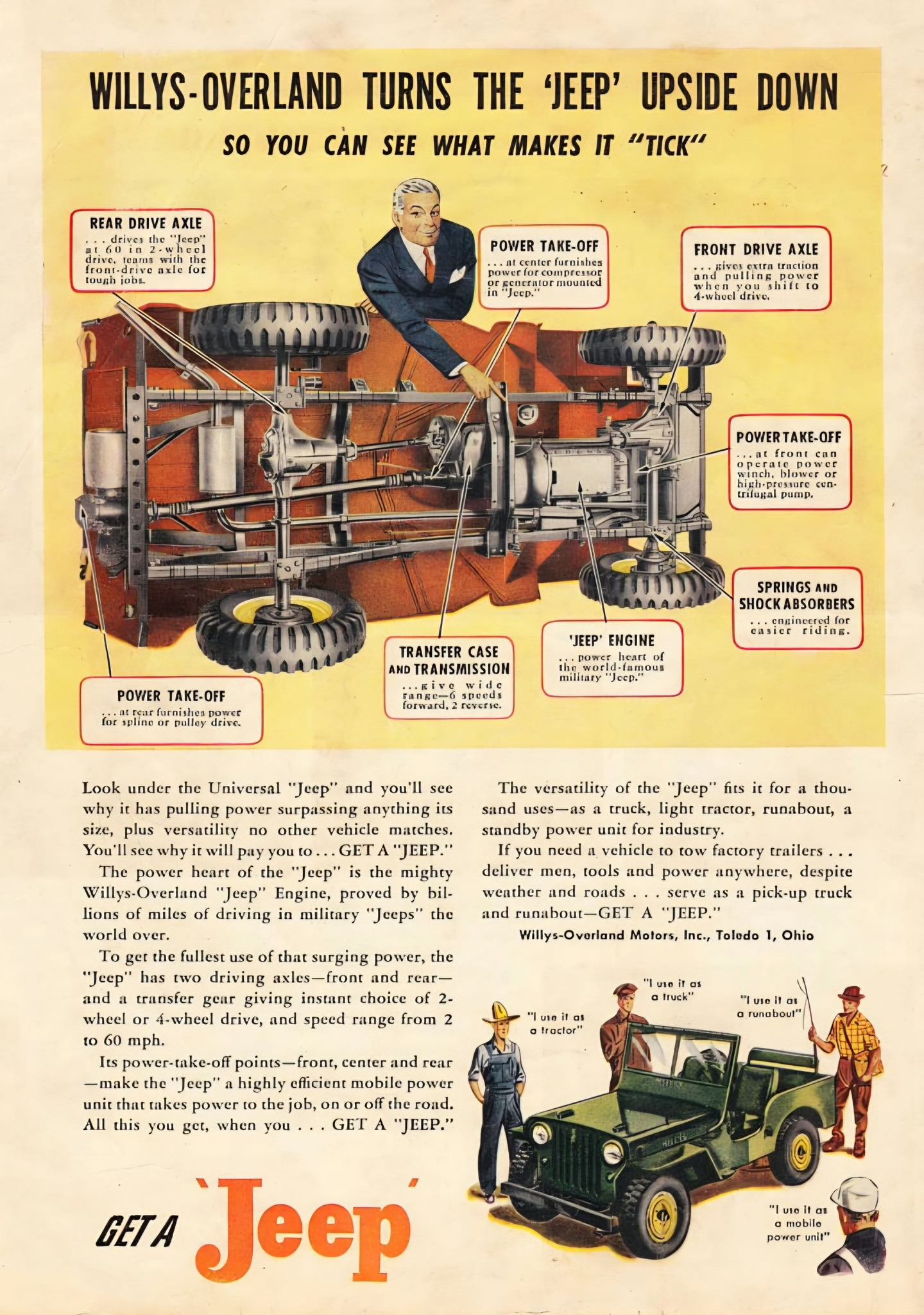 Lolll @ 60mph. Not sure if that ad is for a CJ-3B or CJ-2A, but my friend's CJ-2A can barely break 50mph on a flat road and it's screaming when doing so. 45mph is more realistic.