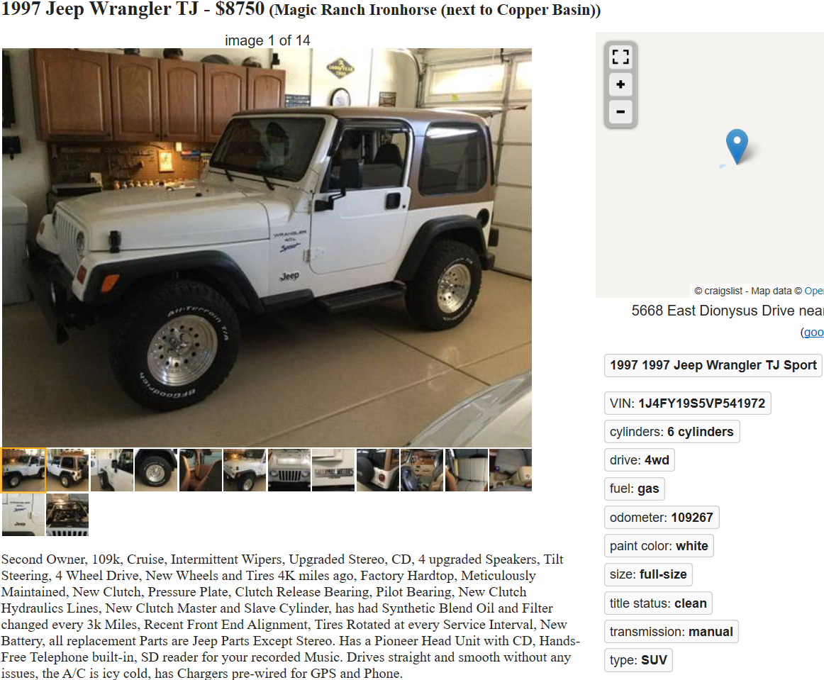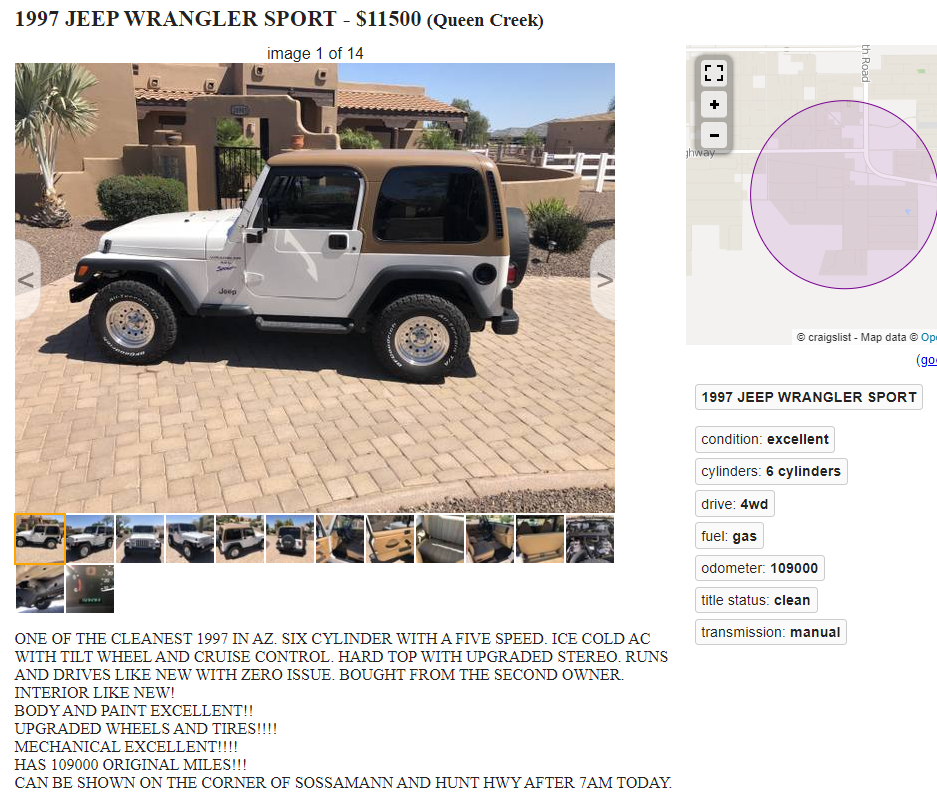 Same happened to me about a month ago. Was going to buy a 2000 Sahara with 53k miles on it for $9500. Garage kept, stock etc. Long story short lady sold it out from under me to some guy in Chandler just to get the sale over with. Popped up on CL a couple days ago in Chandler for $13,300 🙁 I knew whoever bought it would probably just flip it.