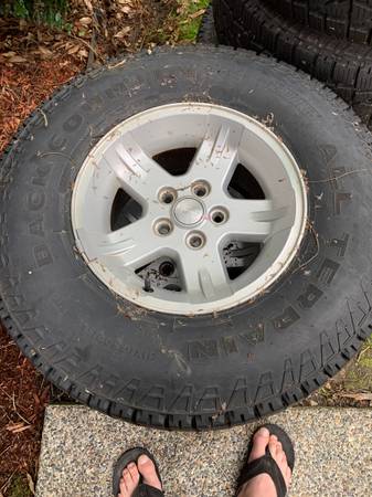 I have a set of 5 rims and tires. Rims are for a 2006 Jeep Wrangler 5x4.5". Tires are rather new, were on the vehicle for less than 10k miles. 40k mile tires. They were rotated using the 5th wheel. I changed size of tires when I lifted my jeep so my loss your gain. $250