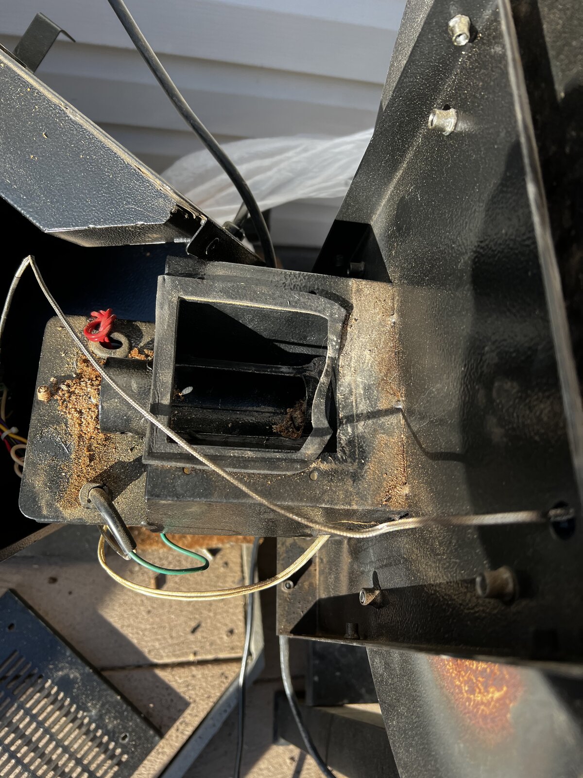 Emptied the pellets & found saw dust impacted around the part of the auger that’s visible. Pulled off the auger motor & couldn’t turn the auger for shit. I had to put a pair of vise grips on the stub & work it back & forth until it started to move. There was so much saw dust in there I actually had to unscrew the thing through the compacted dust.