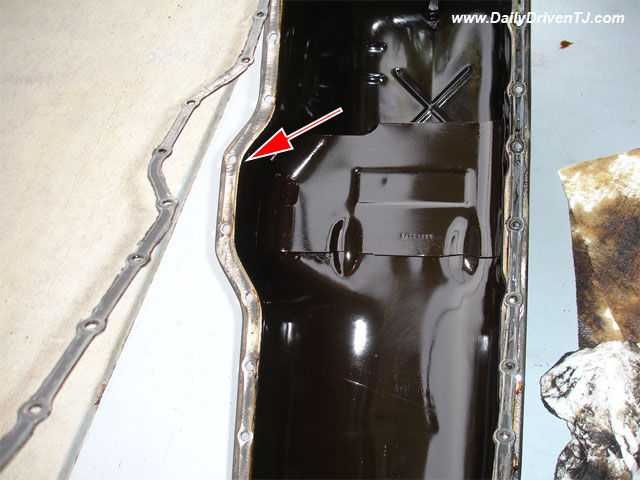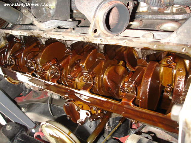 4. Once the oil pan is out of the Jeep, this is what it looks like. Your engine may look different with less brown. My Jeep is 10 years old, JFYI.