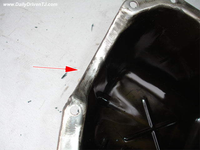 8. Start cleaning the mating surfaces. Make sure things are cleaned down to the metal without removing any metal. I used old tooth brush with a lot of elbow grease. Make sure there is no oily residue left. This is ABSOLUTELY CRUCIAL for the success of this repair. One little residue of old sealant will cause leak. Oiled surface does not allow the adhesive to adhere properly. I used a paint prepping agent to clean the surface. Pay particular attention to the areas indicated by the arrow.