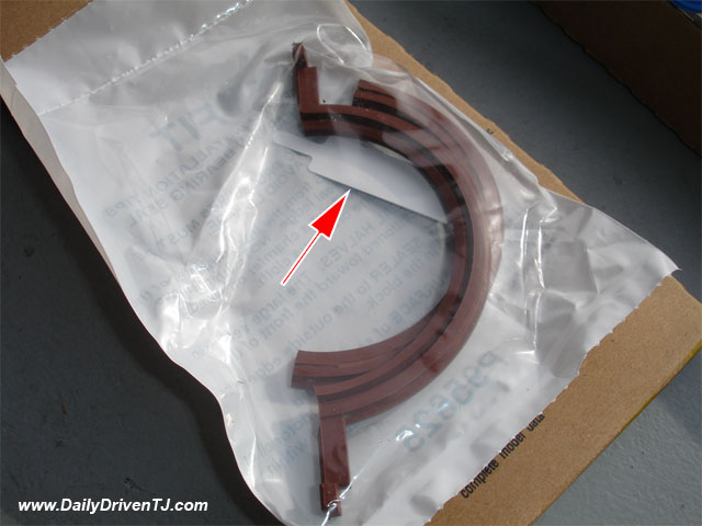 10. Install the upper half of the seal after lubing with some engine oil. DO NOT PUT ANY SEALANT ON THIS SEAL! With the seal's lip opening towards the front of the vehicle.