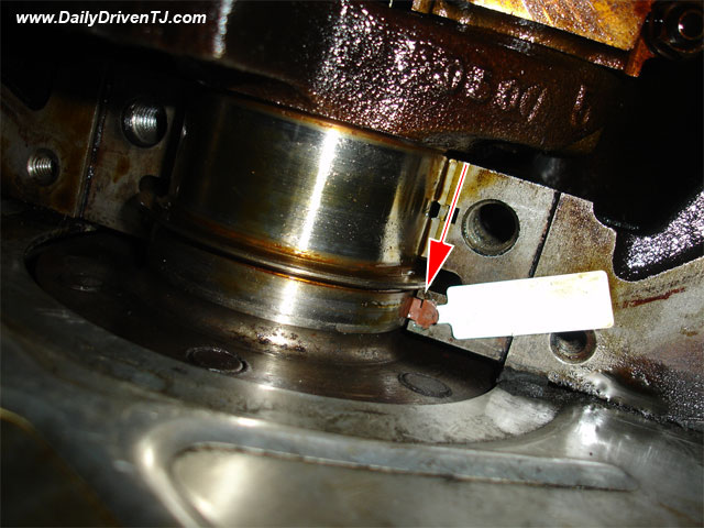 11. Start applying Chrysler Anaerobic Sealant or Loctite 518 on the rear main bearing cap mating surfaces as shown in the following picture. You DO NOT NEED MUCH. It is CRUCIALthat you DO NOT get any of this sealant on the lip of the seal! Make sure you compensate for the spread of the sealant once it is jammed between the surfaces. Put some engine oil on the bearing!!