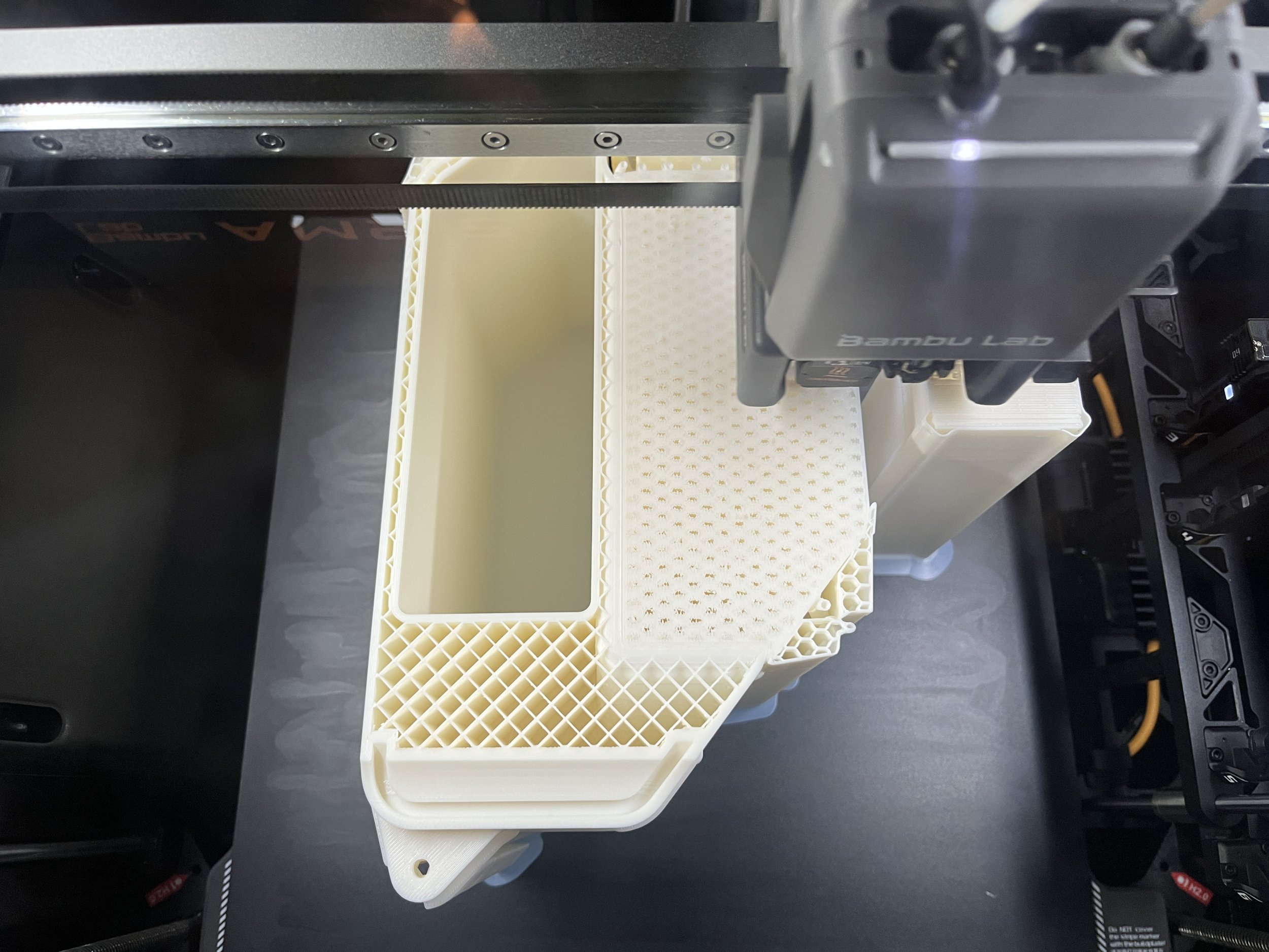 @chili_pepper - thanks for the hot tip. This print, with honeycomb support, has been running for 10 hours and it's by far the most stable of all the prints at this point in the job. I suspect that now my challenge will be keeping the piece attached to the build plate because it's so much more rigid. Here are some pictures taken a few minutes ago: