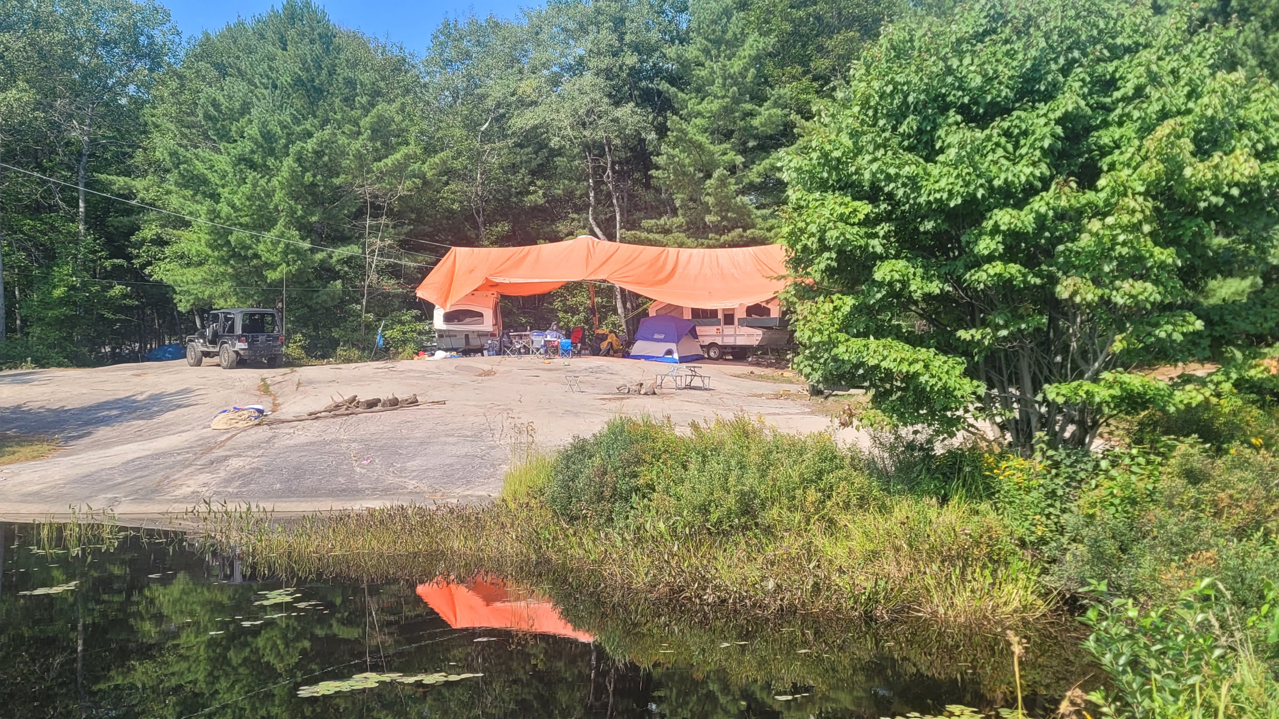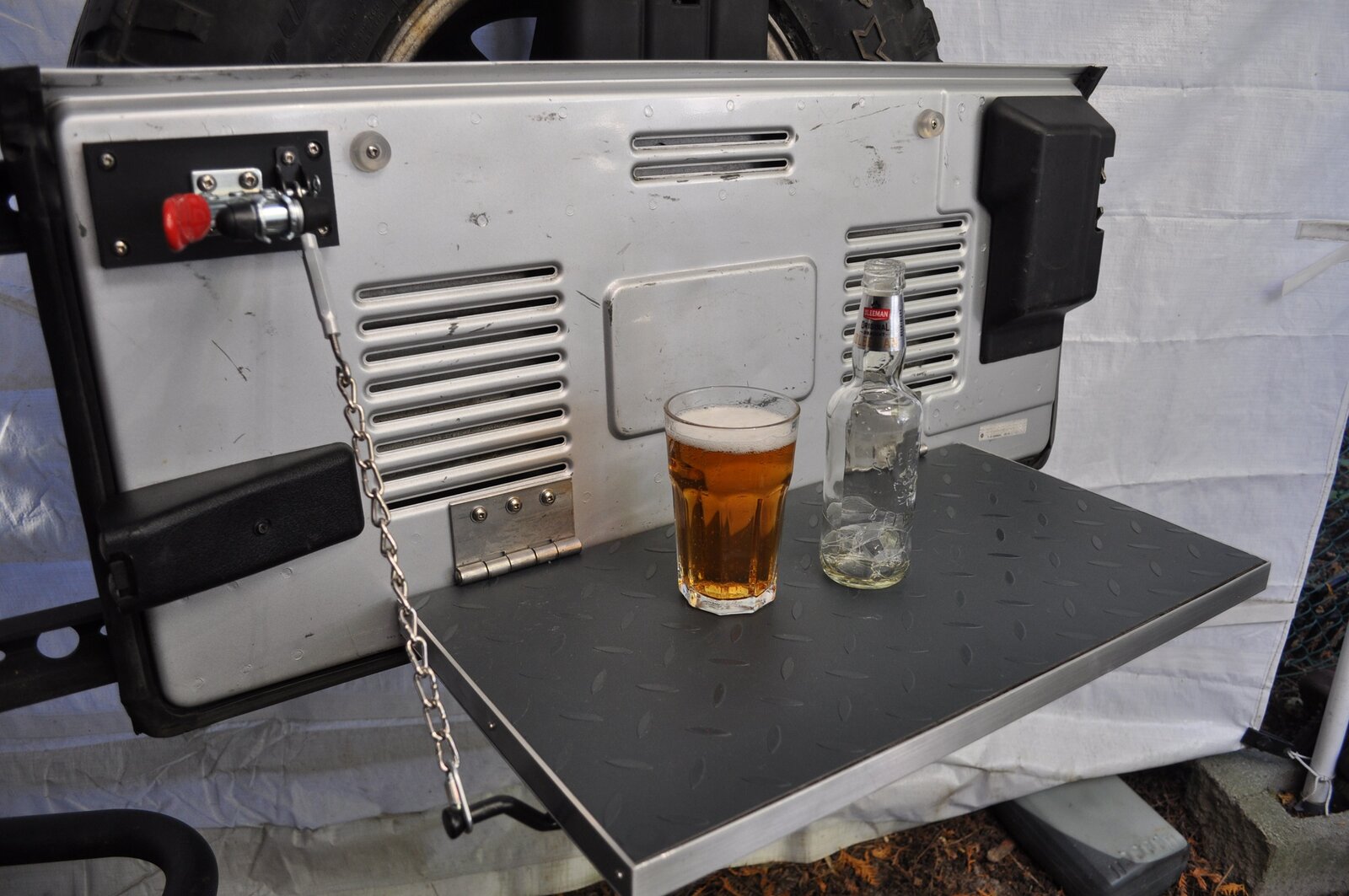 Nice setup. Im always stocking up on Sleemans honey brown when I cross the border. In fact I extinguished my supply last night! I wish it was imported to US.I built the tailgate table. It's basically 3/4" pine covered by 16 gauge aluminum. The table top is a vinyl floor tile. I painted my LJ grey since the pics below were taken.