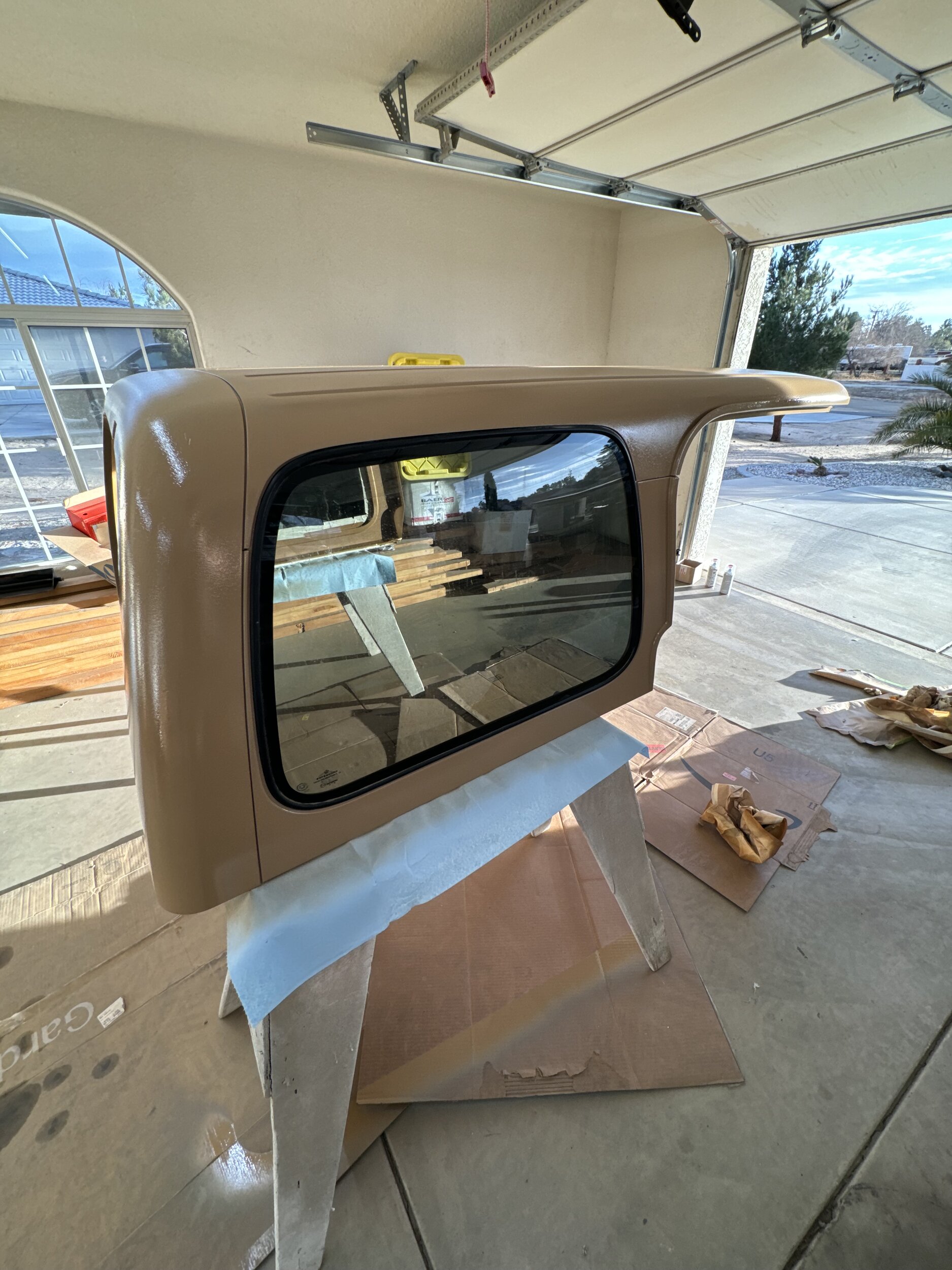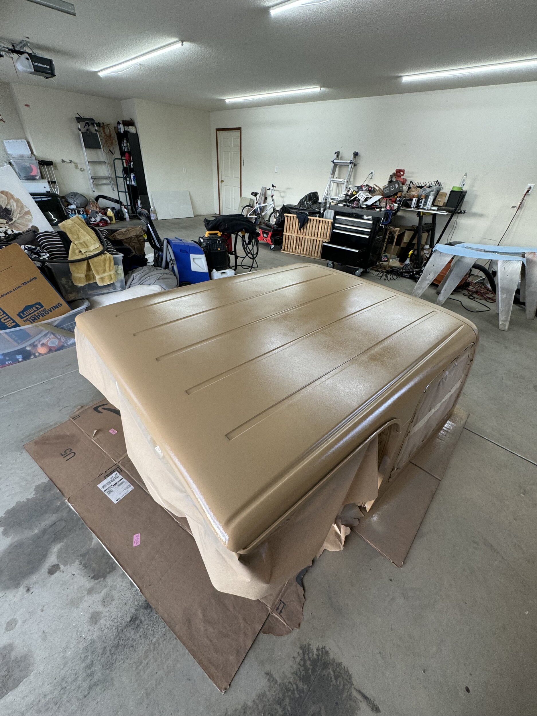 SEM Camel paint. This was the closest color I had seen that would match the interior color. I took the top and brought it into the garage to get it prepped. I started off by flipping the top upside down and onto some saw horses so I could get a better look at it without having to sit on the ground. I started out using a degreaser to get the gunk loosened up. The top had been sitting outside for a few months so there was a lot of dust and prior to this it had been hanging in my Dad's garage for probably close to a decade. After hitting it with the degreaser, I then gave it an IPA bath to get it ready to paint. I let it completely dry out and took it off the saw horses and laid it onto it's back pillars and propped it up so I could keep my spray paint can as vertical as possible. This SEM paint from the spray can doesn't like to spray properly unless it's vertical. I chose to not use a primer for the interior, which was probably a mistake, but either way it turned out great.
