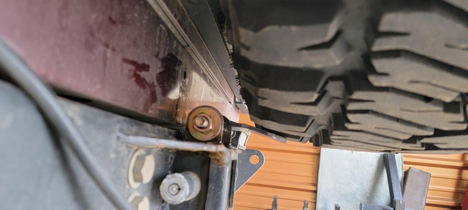 You should ask the fuckwit which pic he is referring to. If it is boogie's, then he also needs his eyes checked. The tire is resting on that u bracket.