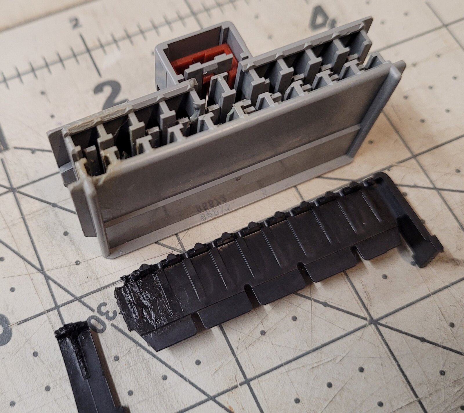 Signs of heat and several broken locking tabs: