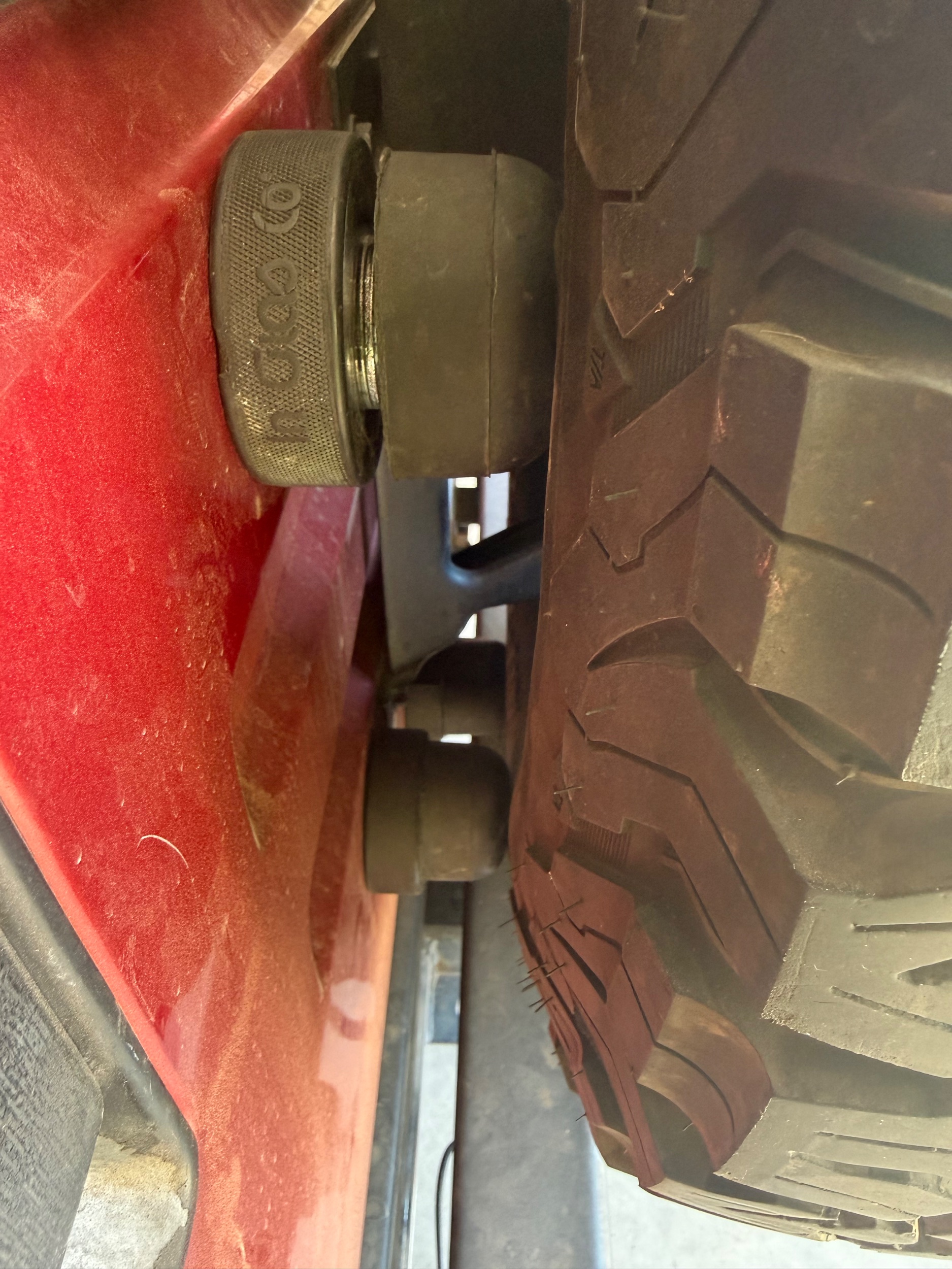 For the investment of five hockey pucks and six fender washers my tailgate FINALLY doesn’t rattle. A previous owner swapped wheels and tires and the backspacing was far enough from stock that the spare tire never made contact with any of the tailgate or lower body bumpers.